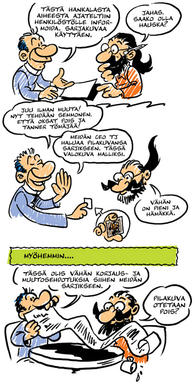 uskaltaako itselle nauraaJoskus yritys tai yhteisö haluaa sarjakuvan henkilöstölehteensä, asiakaslehteensä tai vaikkapa intraansa. Usein se otetaan vain keventämään sisältöä. Sitten saatetaan hoksata, että sopivasti valittu yksittäinen sarjakuvastrippi voi parhaimmillaan tukea viestintää.