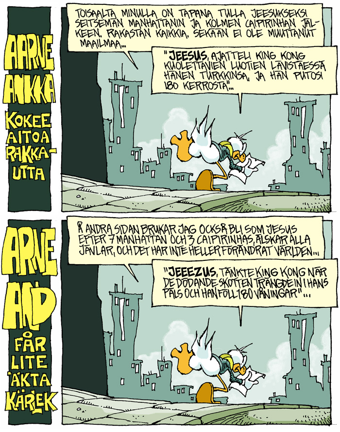 Tuon tuostakin saa kuulla, kuinka sarjakuvat painetaan nykyään vähän miten sattuu: viiva ”palikoituu” eli pikselöityy mikäli riittävän isosta resoluutiosta ei ole pidetty huolta. Tai sitten piirrosviiva muuttuu rasterimössöksi kun PDF on tehty väärillä asetuksilla. Ladottu teksti on tietenkin rumaa fontista riippumatta, sitä vastoin kun ennen tekstattiin käsin, niin jälki oli parasta. Ennen oli paremmin, niin aina. Oliko ennen sitten paremmin? Oliko todella? Hmm?